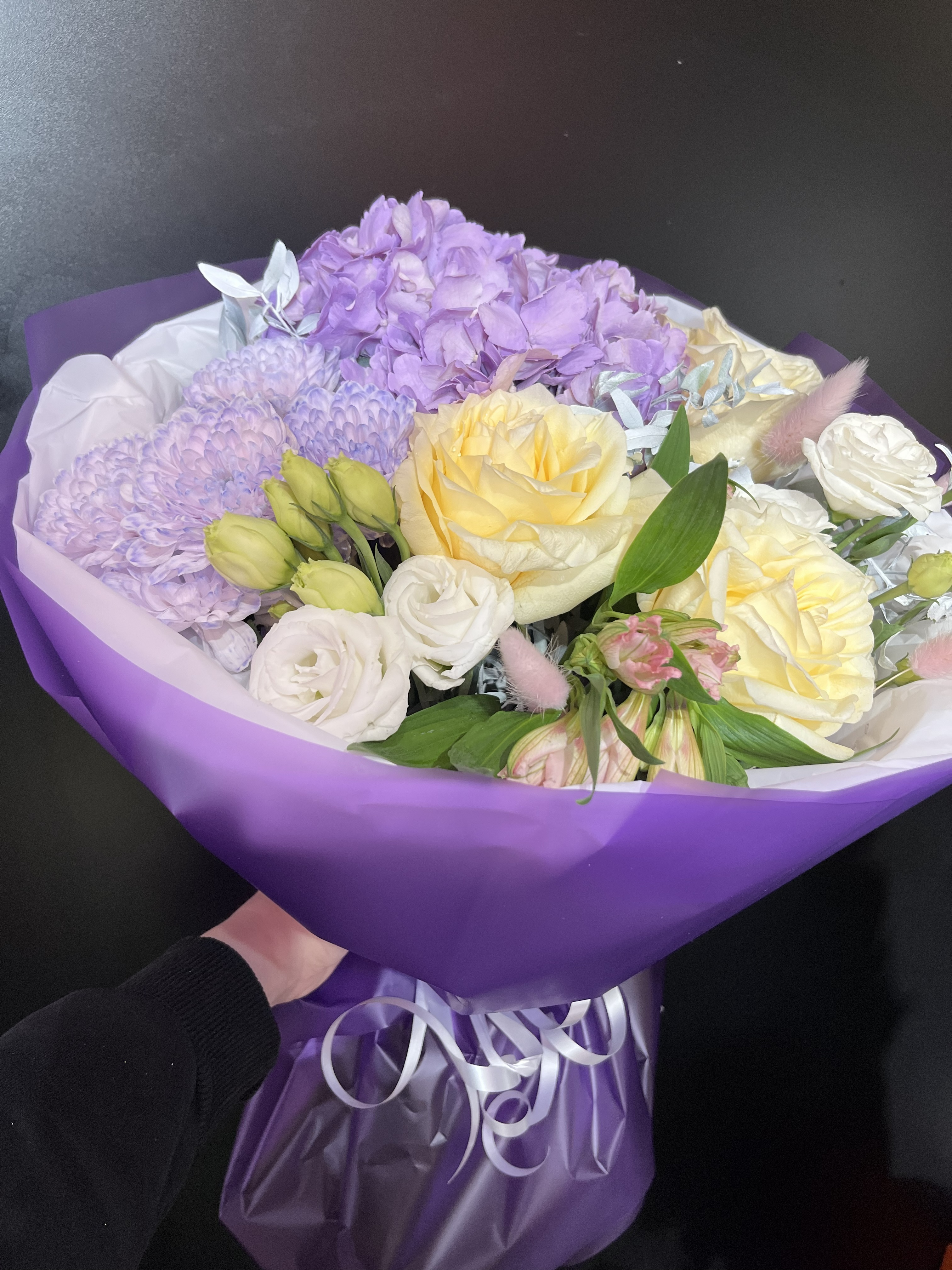 Погрузитесь в атмосферу нежности и элегантности вместе с нашим изысканным букетом! Гортензия глубокого фиолета гармонично сочетается с утонченной эустомой белого цвета и романтичными розами Канделайт. Альстромерия нежно-розового оттенка добавляет свежести, а изящная хризантема завершает образ этого цветочного шедевра. Подарите близким красоту, которая вдохновляет и восхищает каждый день!