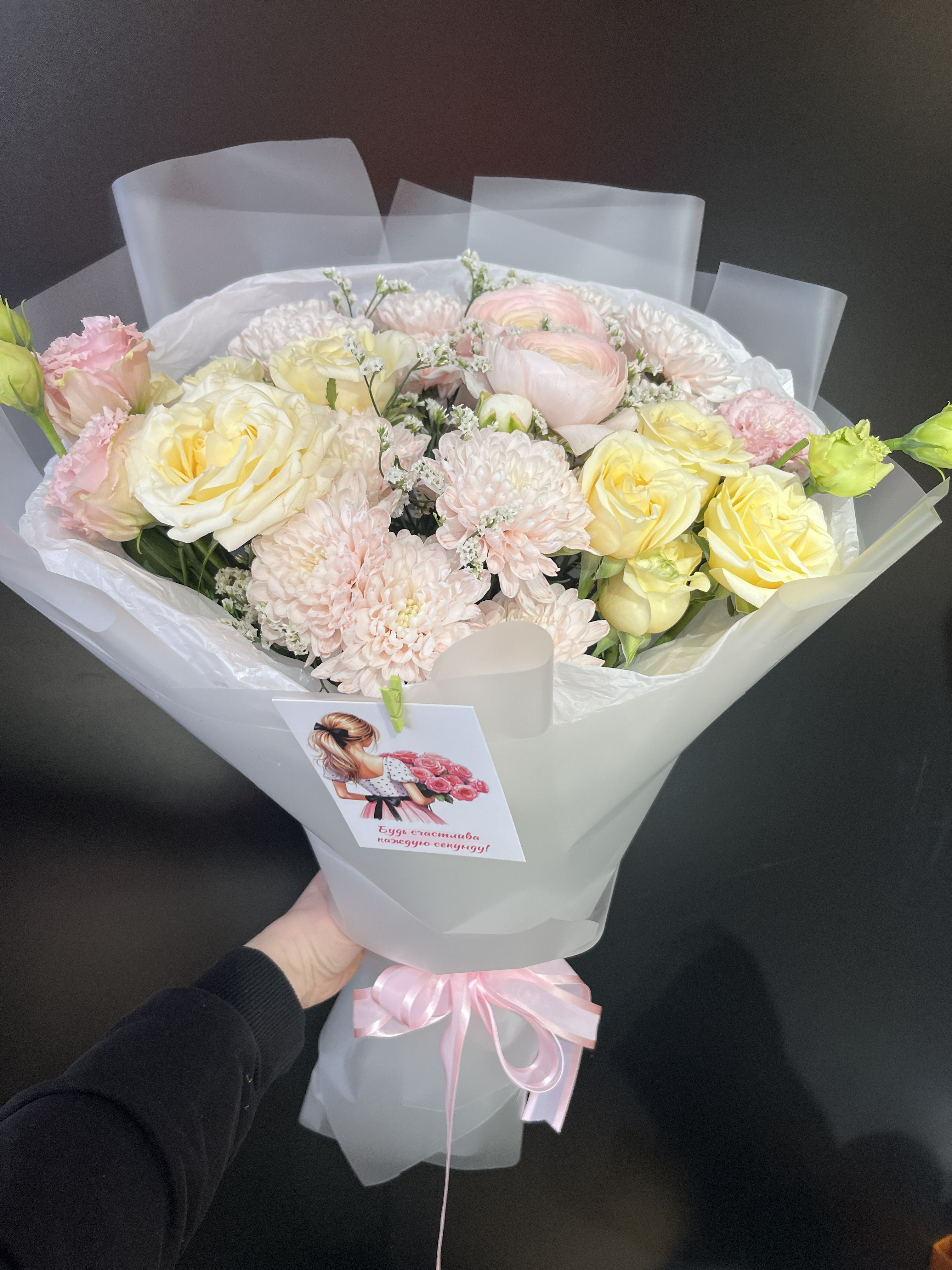 Этот роскошный букет — идеальный способ выразить свои чувства! Роскошные кусты хризантем нежного розового оттенка гармонично сочетаются с пышными цветами эустомы, утонченными бутонами руннукулуса и изысканными лепестками лимониума белого цвета. Добавьте к этому великолепие розы кустовой пионовидной – символ красоты и элегантности! Такой подарок подарит радость любому событию: от дня рождения до признания в любви. Создайте незабываемые эмоции близким людям уже сегодня!
