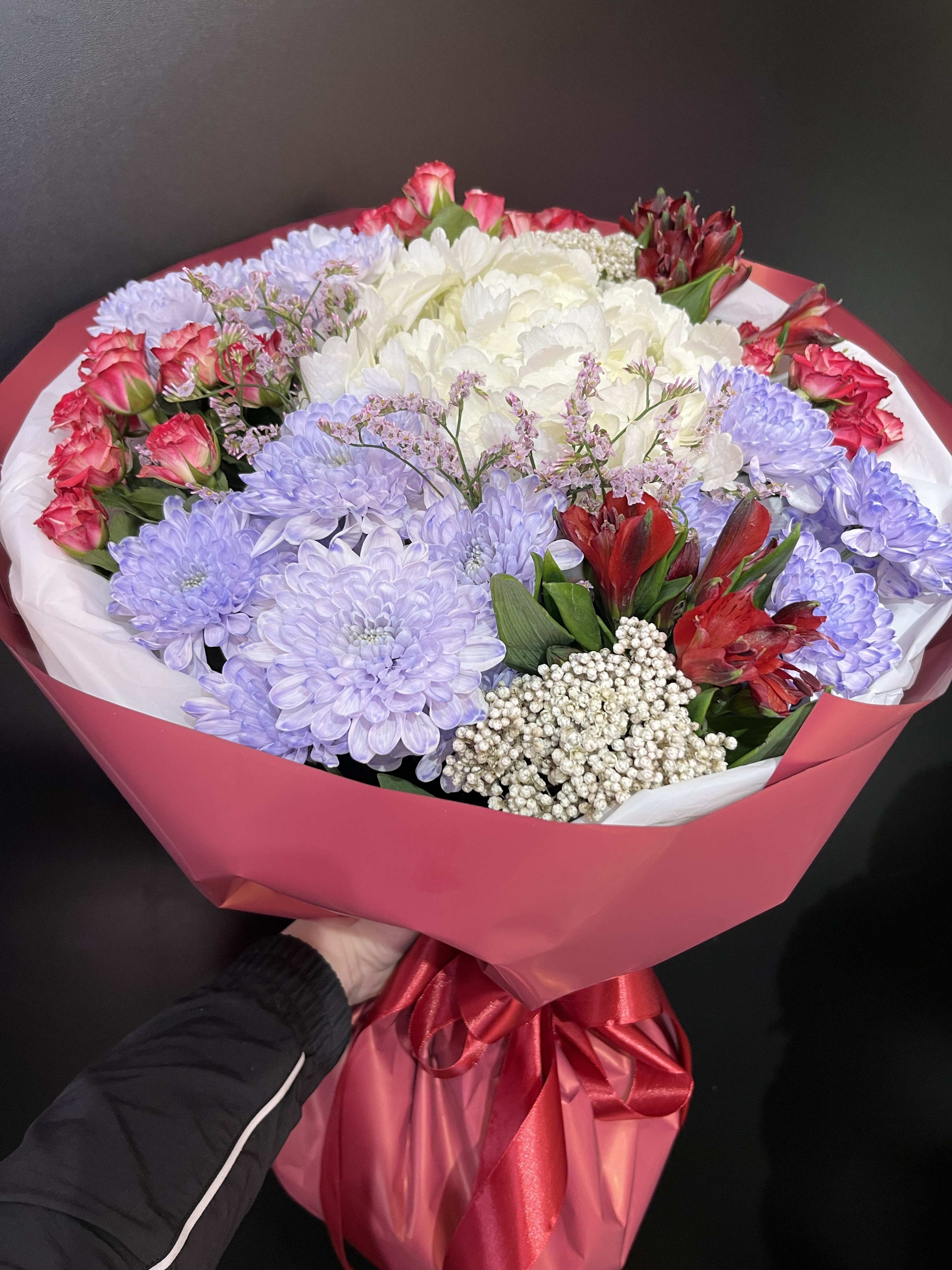 Этот роскошный букет — идеальный выбор для тех, кто хочет выразить глубокие чувства и создать незабываемое впечатление! Бордовые розы символизируют страсть и элегантность, белые гортензии подчеркивают чистоту намерений, а сочетание сиреневого лимониума и фиолетовых хризантем добавляет загадочности и шарма. Альстромерия бордового оттенка завершает композицию, наполняя её теплом и уютом. Этот подарок обязательно порадует близкого человека и украсит любой интерьер!