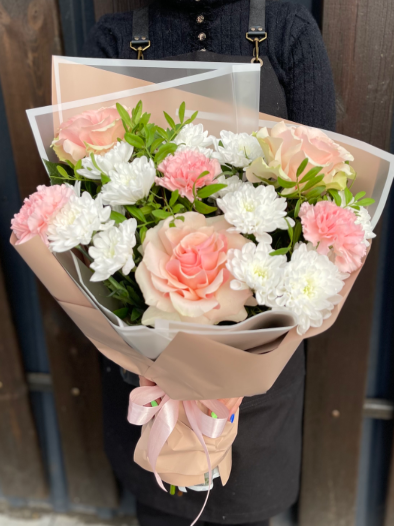Подарите близким нежность и теплоту букета, созданного из изящных цветов! Роза светло-розового оттенка символизирует романтику, гвоздика нежно-розовая – благодарность и восхищение, белоснежная хризантема воплощает чистоту помыслов, а фисташка добавляет оригинальности и изысканности. Этот букет подчеркнёт вашу заботу и станет ярким акцентом праздника! Заказывайте онлайн прямо сейчас и порадуйте любимых роскошным подарком!