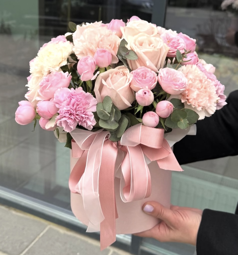 Уникальная композиция в элегантной шляпной коробке — идеальный подарок! Идеально сбалансированный букет из розы, гвоздики кремовой, пышной пионовидной розы кустовой, нежных розовых гвоздик и освежающего эвкалипта подчеркнёт вашу заботу и внимание. Яркие краски подарят радость получателю, а компактная упаковка делает этот презент удобным для любого случая. Создайте незабываемые эмоции с нашим букетом!