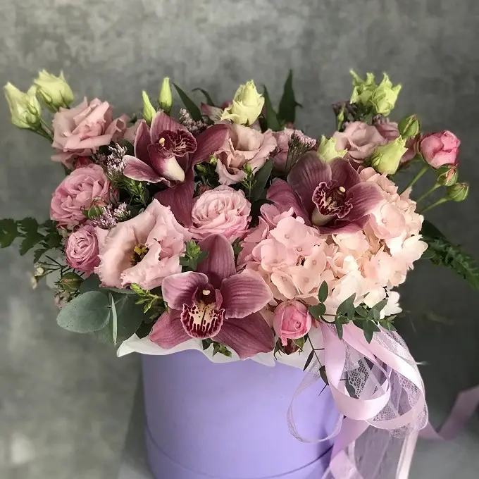 Подарите близким тёплые эмоции с нашей элегантной цветочной композицией! В стильной шляпной коробке гармонично сочетаются изысканная орхидея, нежная эустома и роскошная роза кустовая – все цветы выбраны специально в утончённых розовых оттенках, создающих атмосферу романтики и уюта. Прекрасный подарок для особого случая, который подчеркнёт вашу заботу и внимание.