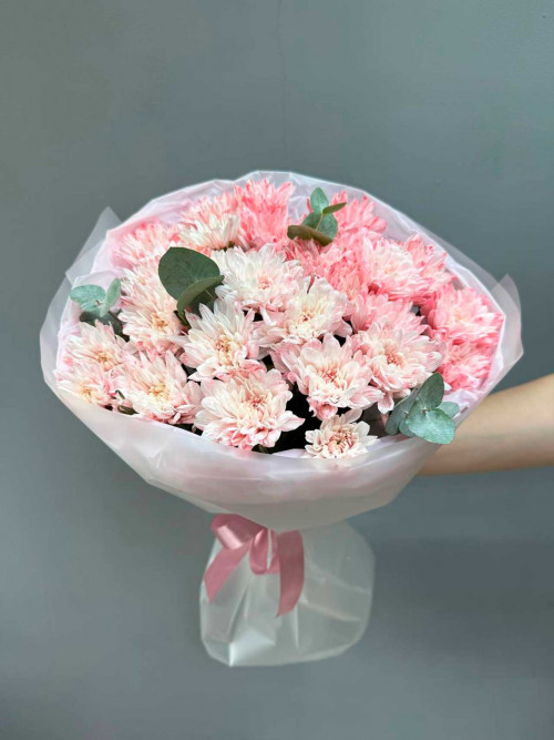 Погрузитесь в нежность бархатных оттенков моно-букета! Кустовые хризантемы изысканного нежно-бордового оттенка гармонично дополнены эвкалиптом — символ чистоты и утончённости букета делает его идеальным подарком для особых случаев. Элегантная простота дизайна подчеркивает индивидуальность получателя. Сделайте близкий человек счастливцем уже сегодня!